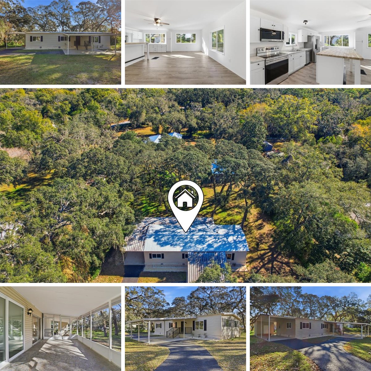 WOW—this one has it ALL! Welcome to this updated 3-bedroom, 2-bath doublewide that’s bursting with upgrades and charm inside and out. From the moment you step inside, you’ll love the bright, open floor plan, oversized living room, brand-new luxury vinyl flooring throughout, fresh paint, drywall walls, new doors, stylish lighting, and loads of natural light from all-new windows and a new sliding glass door. The kitchen is a showstopper! Completely renovated with TONS of new cabinets, a large island, and an open layout that’s great for entertaining, hosting holidays, or everyday living. The primary suite features a walk-in closet and vanity area, while the guest bath brings fun personality with eye-catching retro tile. A separate laundry room tucked under the patio adds convenience you’ll appreciate every day. Outside is where this property really shines—set on a large, mostly fenced lot with mature trees, a circular drive, and two gated entrances for easy access. The updated metal roof adds peace of mind, and the large adorable shed with its own metal roof is ready to be your man cave, she shed, workshop, or ultimate storage space. Two carports and a relaxing screened porch round out this incredible setup. Move-in ready, loaded with upgrades, and packed with possibilities—this is more than a home, it’s a lifestyle. Schedule your showing today before it’s gone!