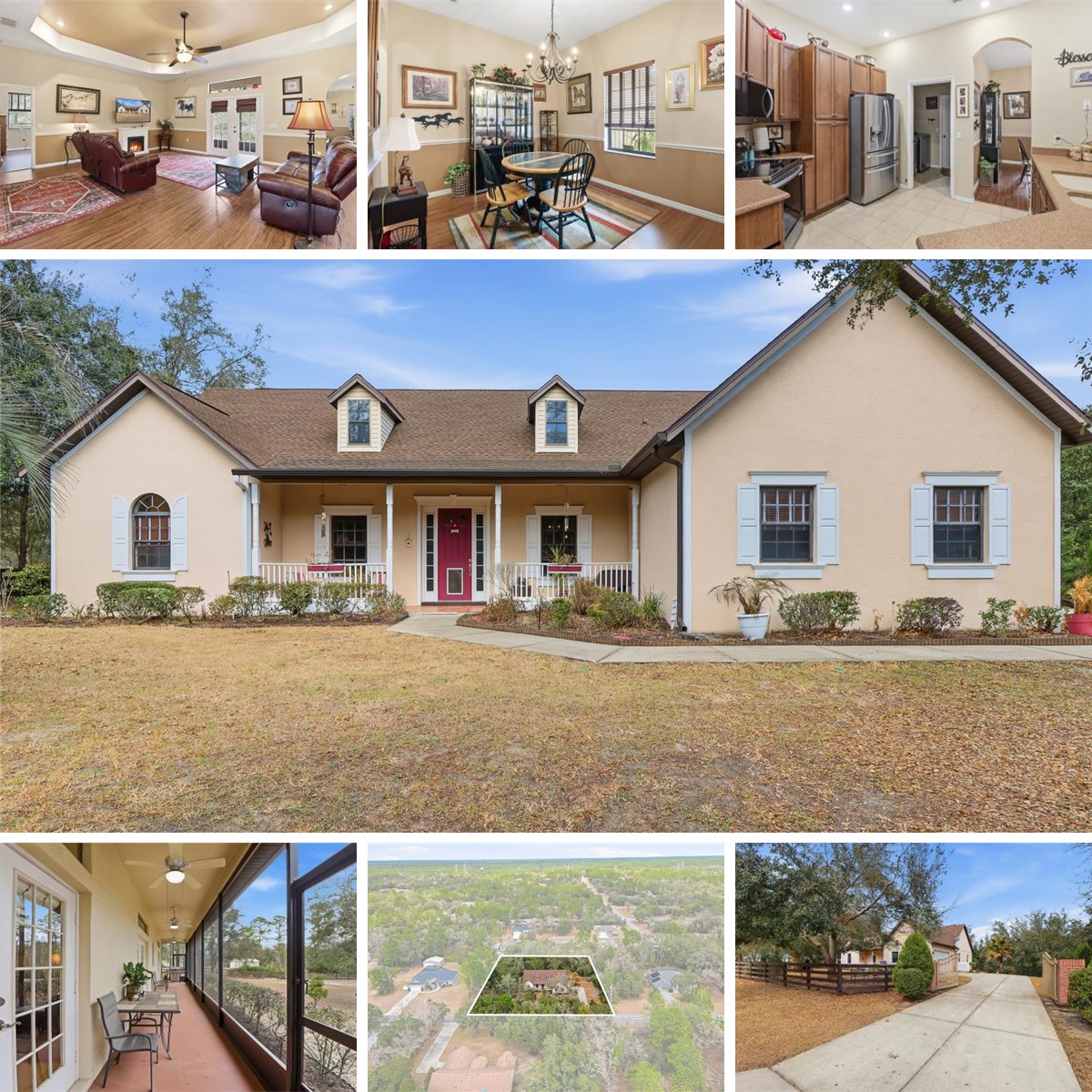 Welcome to this sweet Southern Charmer in the sought-after equestrian community of Pine Ridge! From the peaceful front porch and classic dormer windows, to the solar-powered gated driveway, this home exudes warmth and serenity. Situated on a fully fenced 1-acre lot with mature trees and landscaping, this 3-bedroom + office home offers 2,077 sq. ft. of comfortable living space. Inside, you’ll find new appliances, new luxury vinyl plank flooring in the bedrooms, and a spacious primary suite designed for relaxation. Major updates include a 2022 roof, 2019 HVAC, newer water heater, and newer septic and drain field—providing peace of mind for years to come! Enjoy Florida living year-round on the oversized 45-ft screened rear porch, perfect for entertaining or simply unwinding while overlooking your private backyard - with room for a pool. A utility shed offers additional storage for tools or hobbies. Pine Ridge residents enjoy over 20 miles of dedicated horse trails, community stables, tennis and pickleball courts, and a true equestrian lifestyle—all while being conveniently located near shopping, restaurants, and medical offices. With easy access to the Suncoast Parkway, Tampa International Airport is approximately one hour away. Enjoy freshwater springs, lakes, the Gulf and all that the Nature Coast has to offer. Come experience the charm, privacy, and peaceful lifestyle that make Pine Ridge living so special!