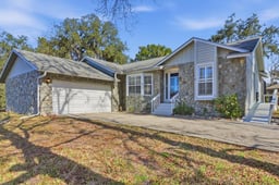 Welcome to this beautifully cared for 3-bedroom, 2-bath pool home that has NEVER FLOODED! This coastal retreat in Riverhaven Village showcases comfort, thoughtful updates, and a peaceful natural setting that come together effortlessly. The home sits high on a desirable corner lot and features a coastal blend of stone accents on the exterior, offering inviting curb appeal from the moment you arrive. Major improvements have already been completed, providing peace of mind with a newer roof and AC with encapsulated ducts (2020), along with a newer front door, interior and exterior paint, updated flooring, and a variety of updates throughout the home in recent years. Additional enhancements include an updated electrical panel and hot water heater (2025), a newer pool pump, and a brand-new pool screen (2024). Inside, the home feels warm and inviting with plantation shutters throughout, luxury wood look floors & a cozy wood-burning fireplace. The nice light & bright eat-in kitchen nook, bar counter, plus additional dining room, give plenty of space to enjoy a meal. Don't miss the indoor laundry room with lots of storage space, plus washer & dryer included for your convenience. The primary suite offers a large master bath and a generous walk-in closet, creating a relaxing & comfortable retreat. The super clean garage with painted floors, and full-home gutters further reflect the pride of ownership seen throughout. Best of all, this property has NEVER FLOODED!