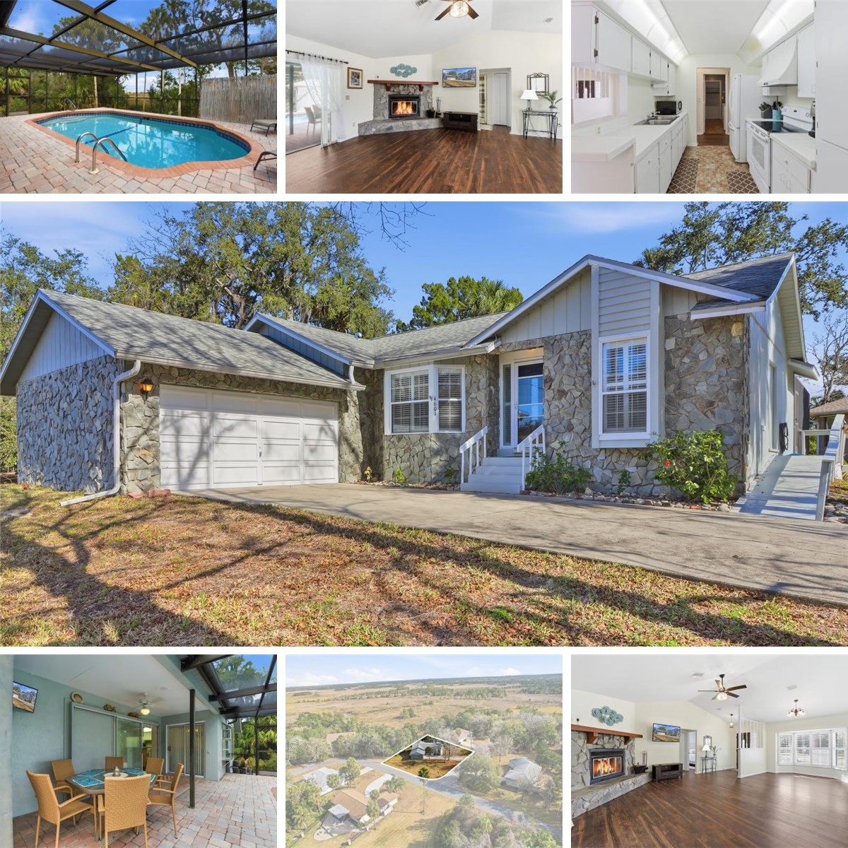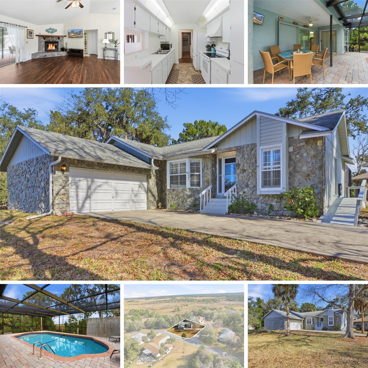 Welcome to this beautifully cared for 3-bedroom, 2-bath pool home that has NEVER FLOODED! This coastal retreat in Riverhaven Village showcases comfort, thoughtful updates, and a peaceful natural setting that come together effortlessly. The home sits high on a desirable corner lot and features a coastal blend of stone accents on the exterior, offering inviting curb appeal from the moment you arrive. Major improvements have already been completed, providing peace of mind with a newer roof and AC with encapsulated ducts (2020), along with a newer front door, interior and exterior paint, updated flooring, and a variety of updates throughout the home in recent years. Additional enhancements include an updated electrical panel and hot water heater (2025), a newer pool pump, and a brand-new pool screen (2024). Inside, the home feels warm and inviting with plantation shutters throughout, luxury wood look floors & a cozy wood-burning fireplace. The nice light & bright eat-in kitchen nook, bar counter, plus additional dining room, give plenty of space to enjoy a meal. Don't miss the indoor laundry room with lots of storage space, plus washer & dryer included for your convenience. The primary suite offers a large master bath and a generous walk-in closet, creating a relaxing & comfortable retreat. The super clean garage with painted floors, and full-home gutters further reflect the pride of ownership seen throughout. Best of all, this property has NEVER FLOODED!