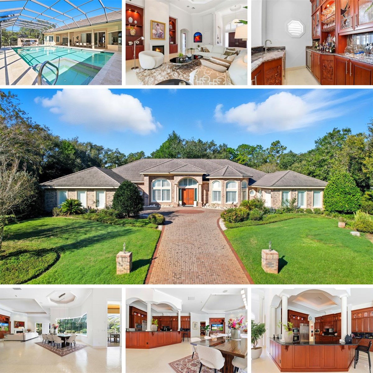 A dedicated office with full built-ins and a second primary suite with private pool entrance, walk-in closet with built-ins, jetted soaking tub, oversized shower, and dual vanities complete the interior.